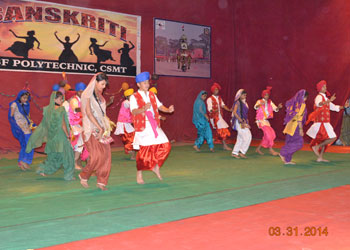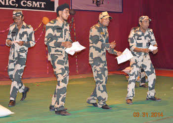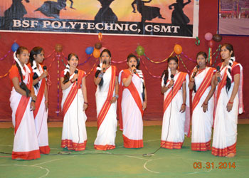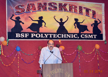 SANSKRITI - 2014 The annual function” Sanskriti -2014” of BSF Polytechnic, CSMT was organized on 31st March 2014, at the Mahadaji Scindia Auditorium, BSF Academy. Sanskriti -2014 started with the lighting of the lamp ceremony by the chief guest Shri Santosh Mehra, IPS, Dy. Director, BSF Academy Tekanpur, Shri Mukesh Tyagi Comdt. CSMT / Principal BSF Polytechnic and Miss Neelam Mathur, Head Academics of BSF Polytechnic. The students presented Saraswati Vandana paying obeisance to goddess Saraswati and the annual report was presented by the Principal Sh. Mukesh Tyagi followed by the prize distribution ceremony where the students who excelled in the field of academics, sports & co – curricular activities received the prizes. Marathi folk, a dance number paying tribute to women, expression less dance presentation and super boys dance were presented by the students. The instrumental & vocal mix, Energetic Bhangra, Patriotic “Theme Dance” added colours to Sanskriti. Musical cricket dance & comedy skit entertained the crowd. A number of melodious solo songs were presented by the students. The students actively participated and the programme was an entertainment feast for the audience.